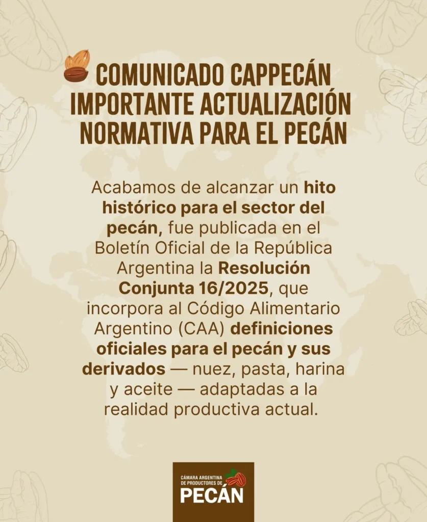 El 1 de diciembre de 2025 se publicó en el Boletín Oficial la Resolución Conjunta 16/2025 (ANMAT y Secretaría de Agricultura, Ganadería y Pesca), que actualiza e incorpora definiciones oficiales para el Pecán y sus derivados en el Código Alimentario Argentino (CAA), con vigencia desde el día siguiente a su publicación.